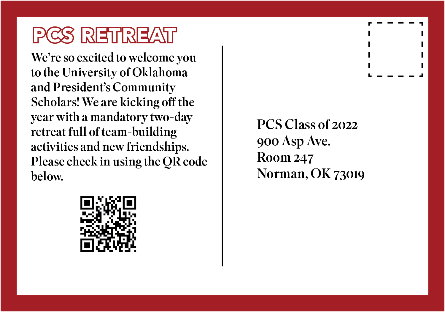 This postcard was created for my public relations design class. The postcard is for the president’s community scholars (PCS) fall retreat. It was made for incoming students to inform them about the retreat and get them excited for the weekend. I made this through InDesign and got some experience by playing around with graphics/text.